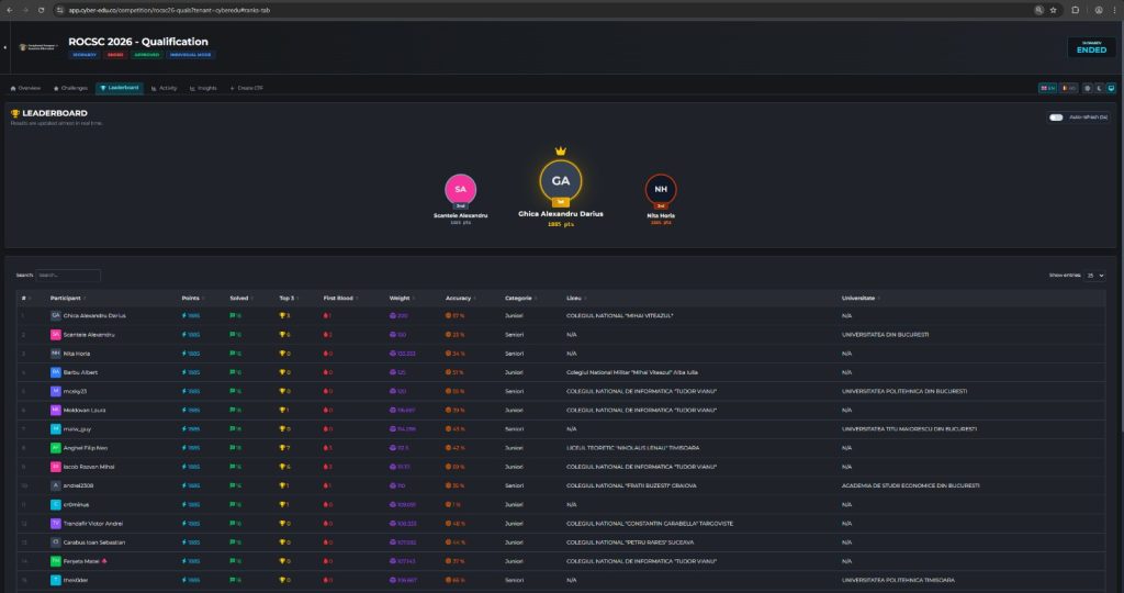 I qualified to the ROCSC (Romanian Cybersecurity Championship) final. We were 20 people that qualified, all with perfect score, just different times. Date: February 20-22, 2026 See you at the ROCSC final, in May 2026 Thank you, Cyber Edu Matei Ferseta 🍁– 11th-grade student at Colegiul Național de Informatică “Tudor Vianu” – President of Vianu […]