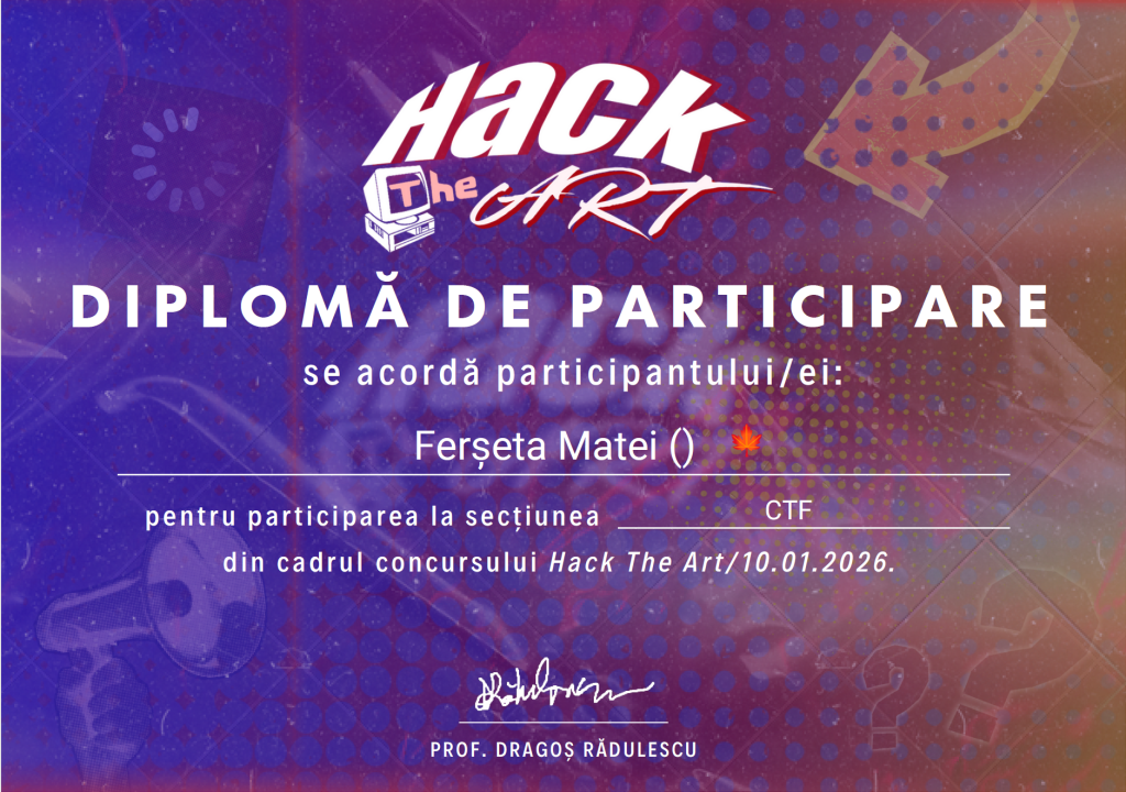 On January 10, I ended up on 4th place at Hack The Art CTF. 🙂 Matei Ferseta 🍁– 11th-grade student at Colegiul Național de Informatică “Tudor Vianu” – President of Vianu Cybersecurity Club – Trainer at Atlantykron – Volunteer at Astrofest, Hallo Fest, Sci-Fi Fest, Poli Fest – Pseudo-Owner of Bacon, my cat. More about […]