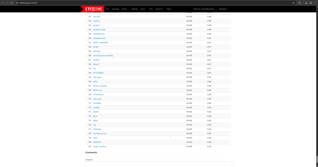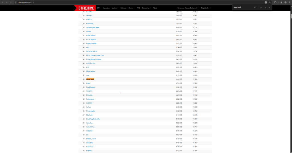 48th place Matei Ferseta– Student at 11th grade, at Colegiul National de Informatica Tudor Vianu – President of Vianu Cybersecurity Club – Trainer at Atlantykron – Volunteer at Astrofest, Hallo Fest, Sci-Fi Fest, Poli Fest – Pseudo-Owner of Bacon, my cat. More about me here. mapleleaf.ro